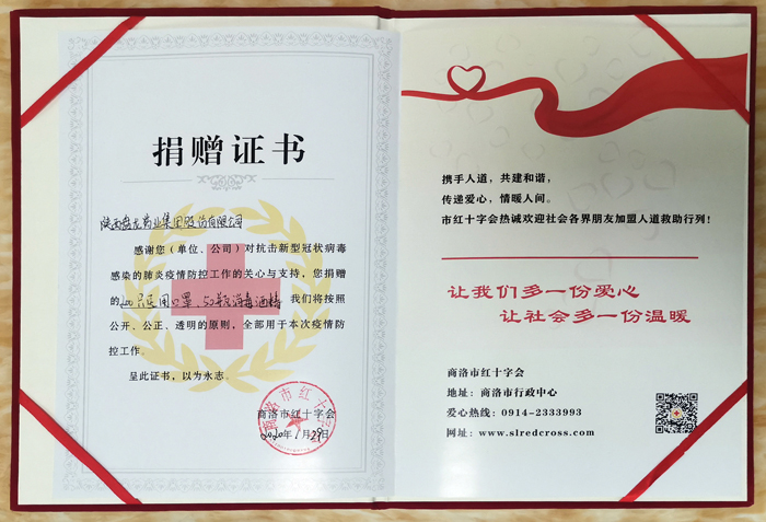 为起劲应对新型冠状病毒熏染肺炎疫情,,,,,,,公司向商洛市红十字协会捐赠了200个医用口罩,,,,,,,50瓶医用酒精